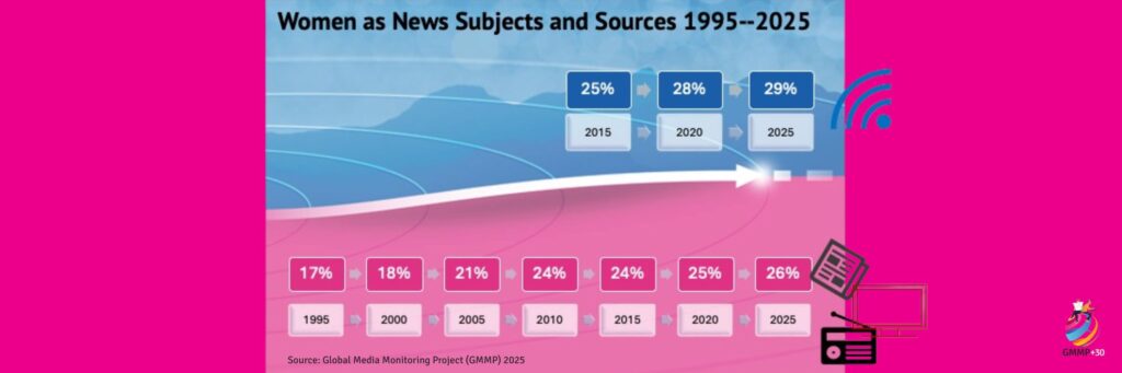 The data in the special edition GMMP from 2025 show that there has been a mere nine-point increase in women’s presence in the news in those 30 years, Macharia reported – with most of this coming in the first 15 years after Beijing.
